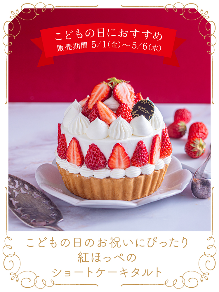 5/1以降の受取。こどもの日におすすめ。紅ほっぺいちごを飾った、ふわふわのショートケーキタルト。