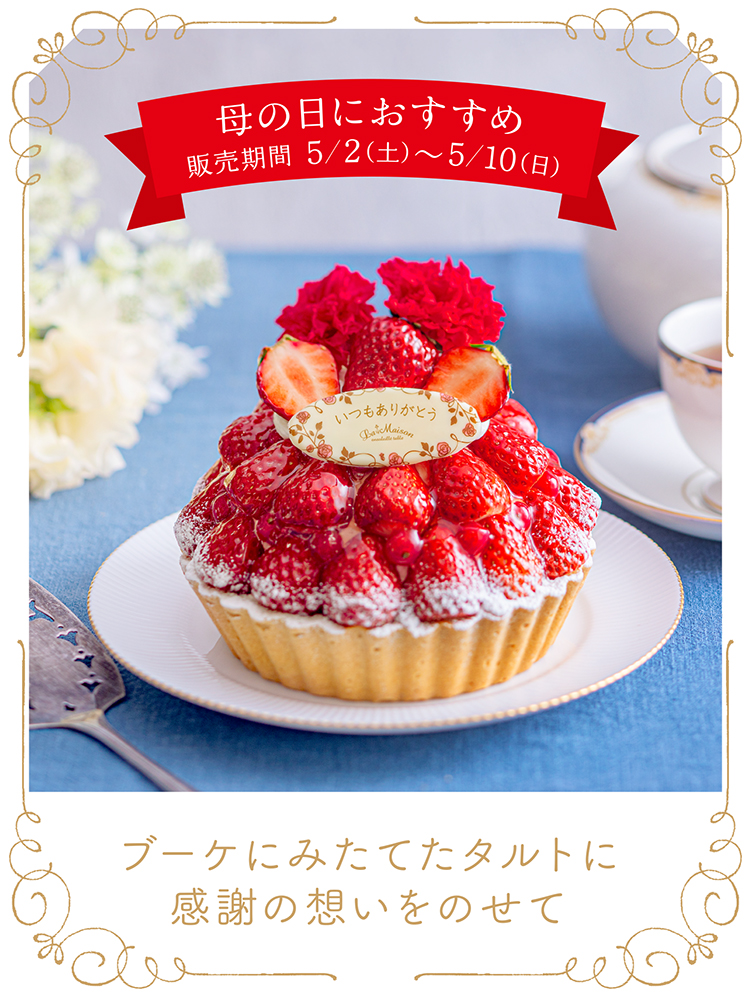 5/2以降の受取。母の日におすすめ。カーネーションといちごを贅沢に飾り、ブーケにみたてた母の日にぴったりなタルト。
